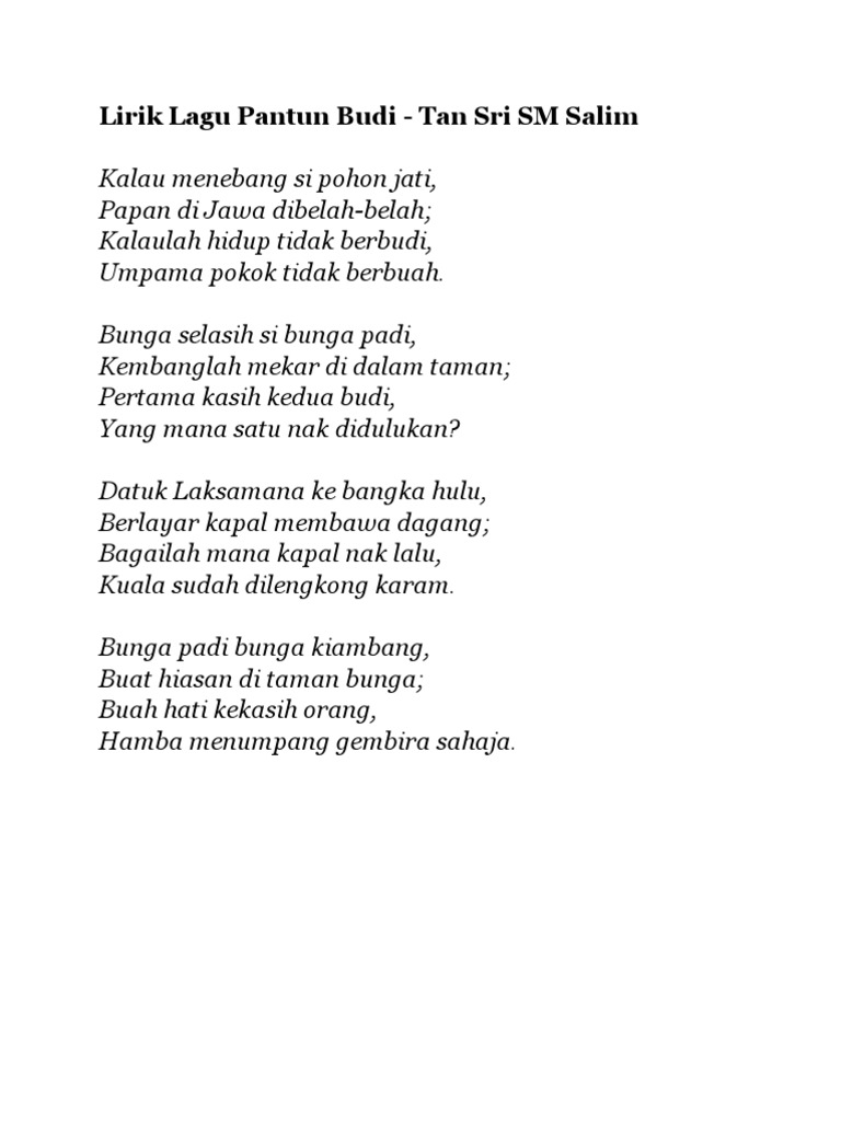 Waiting for you Anpanman. Isih iso bolong keno tetes banyu. Lirik Lagu Pantun KlasikTradisional i Pisang emas dibawa belayar Masak sebiji di atas peti Hutang emas boleh dibayar Hutang budi dibawa mati ii Pulau Pandan jauh ke tengah Gunung Daik bercabang tiga Hancur badan dikandung tanah Budi yang baik dikenang juga.